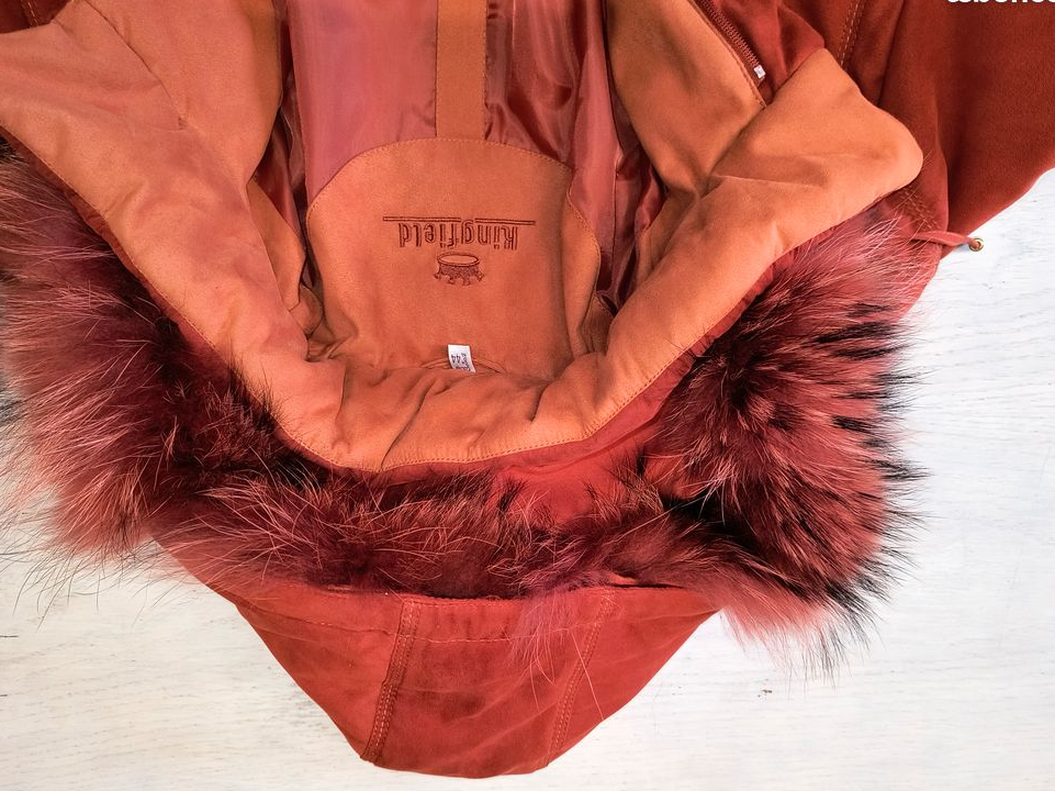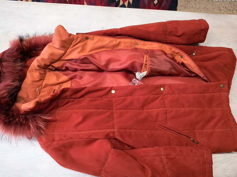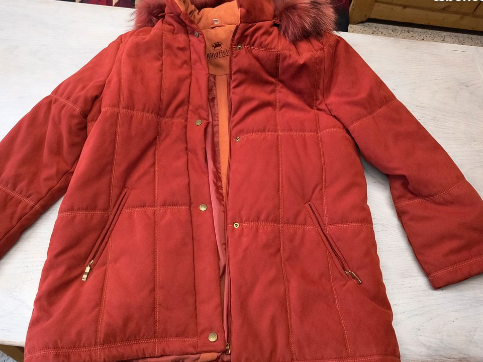 Vends cette longue veste d'hiver, mise une fois, avec capuchon amovible couleur rouge rouille.
