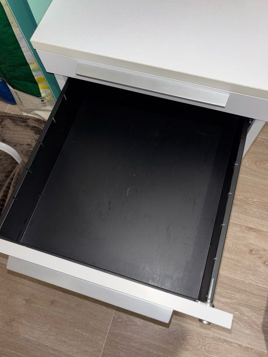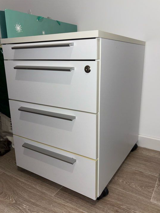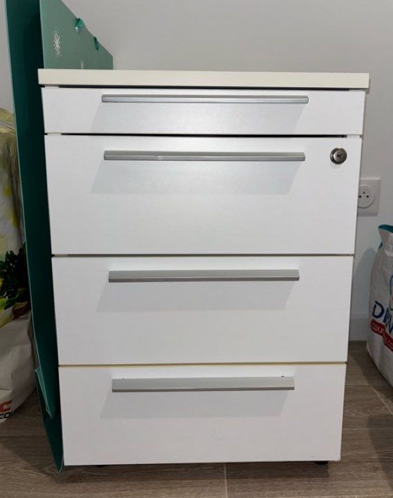 Je vends cette commode blanche en bois, idéale pour ajouter du rangement pratique et moderne à votre bureau !