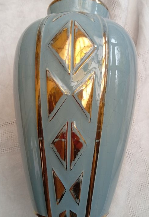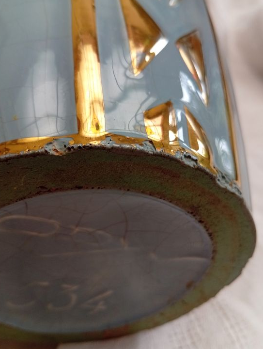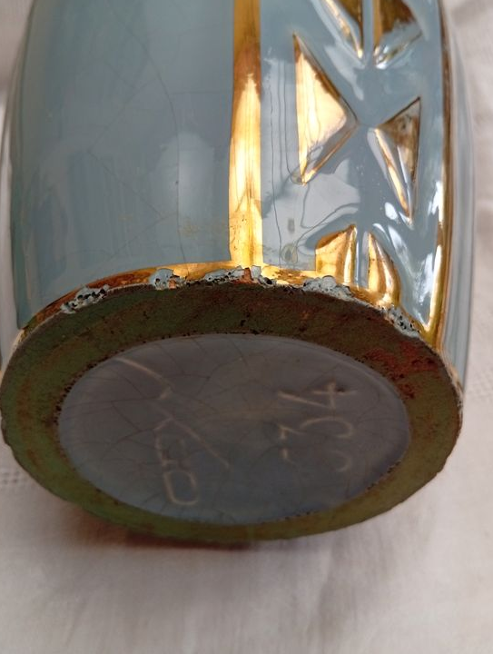 Très beau vase bleu en céramique signé Odyv (manufacture Berlot & Mussier à Vierzon) typique de l'Art Déco français. Décor géométrique avec finition métallisée dorée. Modèle numéroté 534. Émail craquelé brillant.