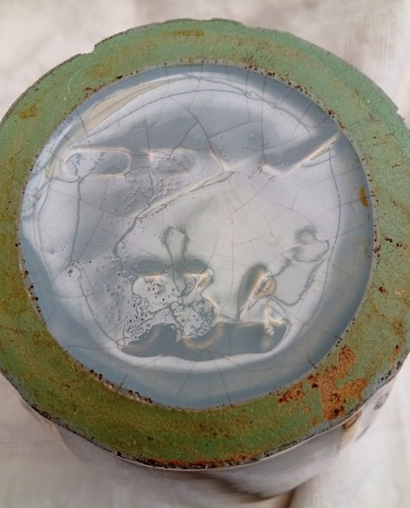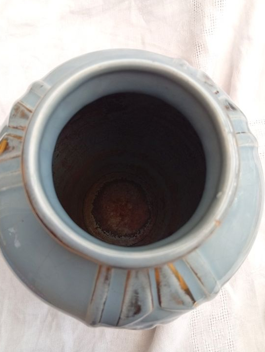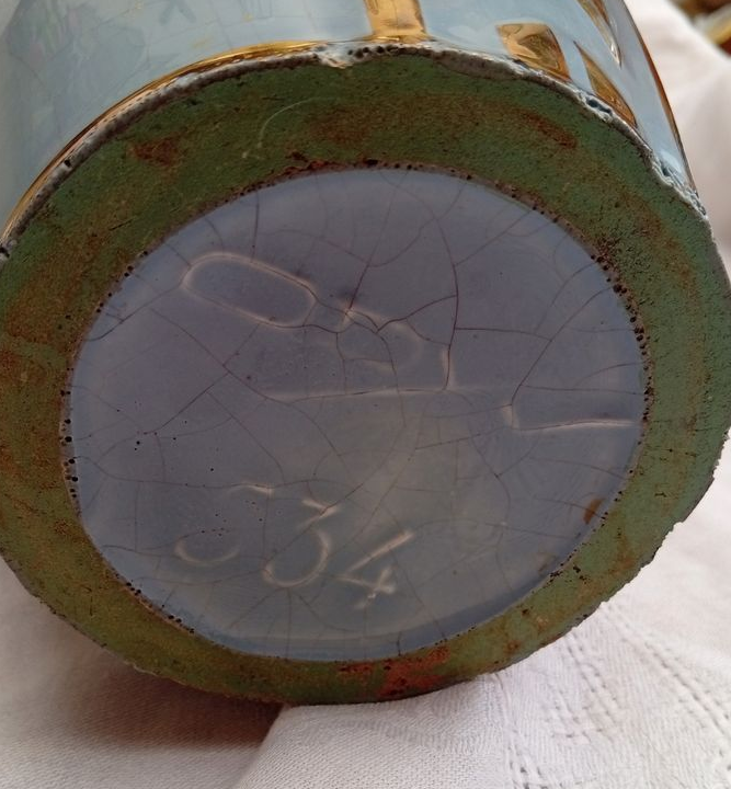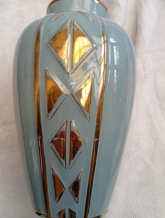 Bon état général mais quelques éclats sur l'arrête de la base et un tout petit sur le col (voir les photos). Pas de fêles. Usure du décor métallique par endroit mais qui n'enlève rien à son charme.