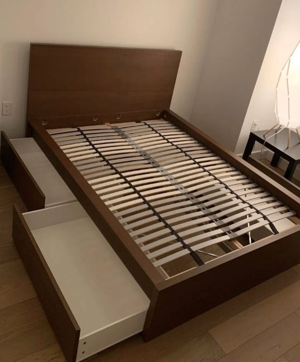 Avec deux tiroirs qui se glisse sous le lit et sommier a lattes.