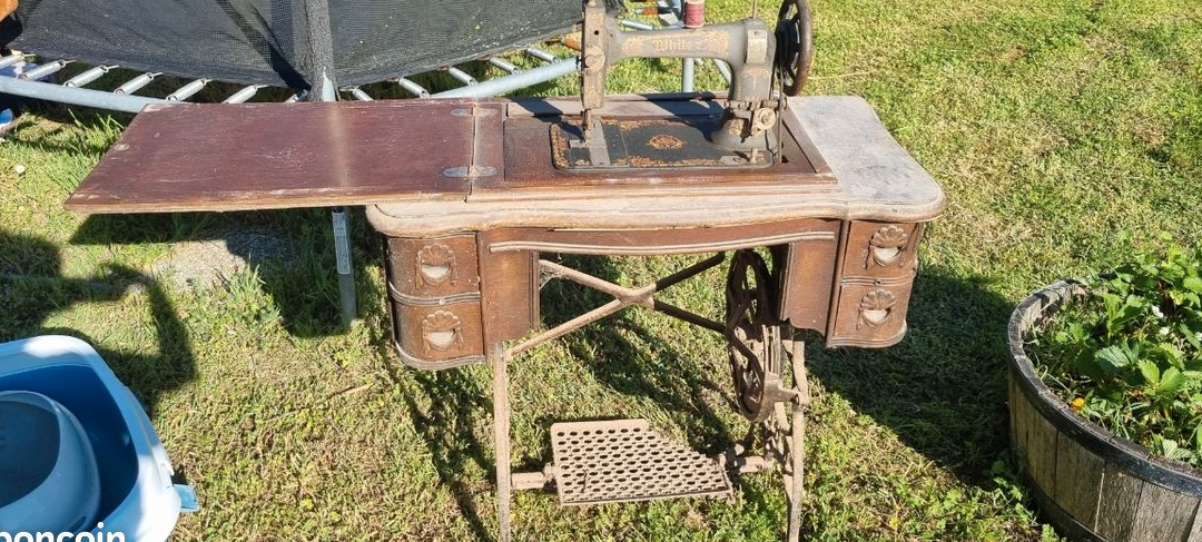 Ancienne machine à coudre White, montée sur son meuble de travail en bois. Un objet de charme pour les amateurs de vintage et de décoration rétro.