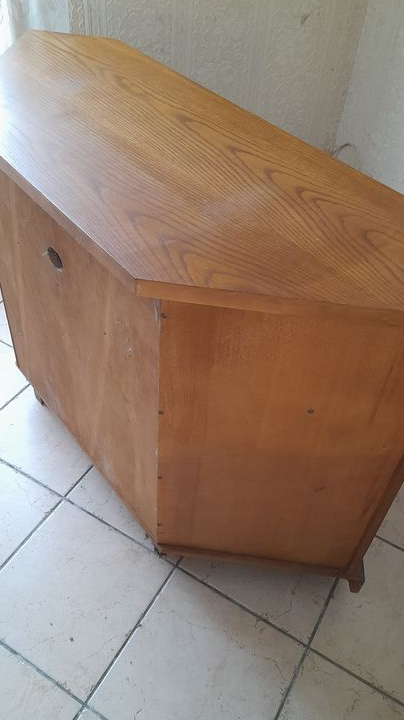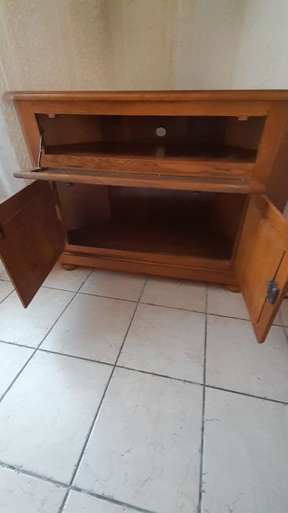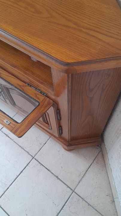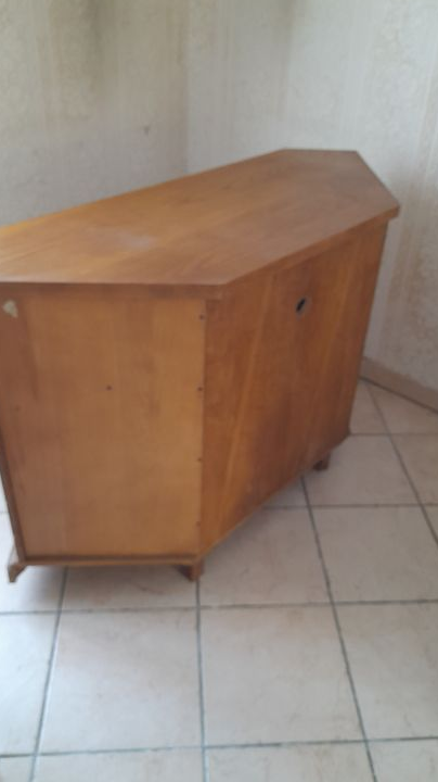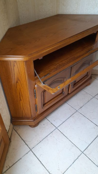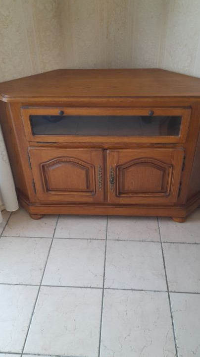 Je vous propose ce meuble TV d'angle en bois massif naturel et en très bon état.