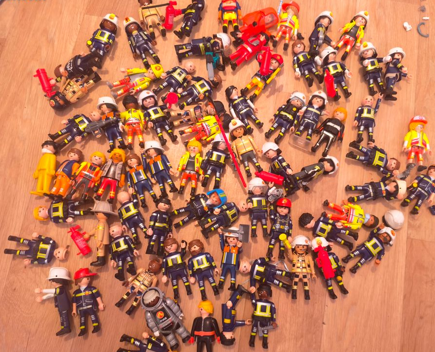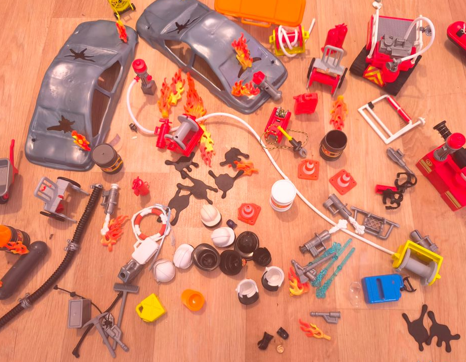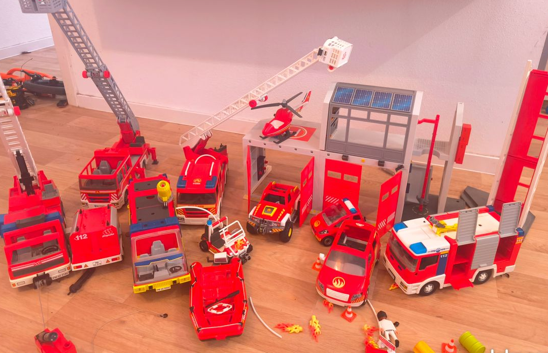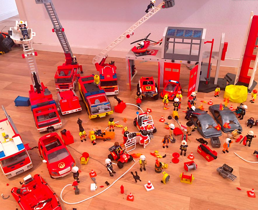 Plus de 60 figurines, plusieurs véhicules de pompier, caserne, tour de séchage, divers accessoires ( matelas, brancard, bouche d'incendie, dévidoirs, gants, tâches d'huile, extincteurs, casques... ).