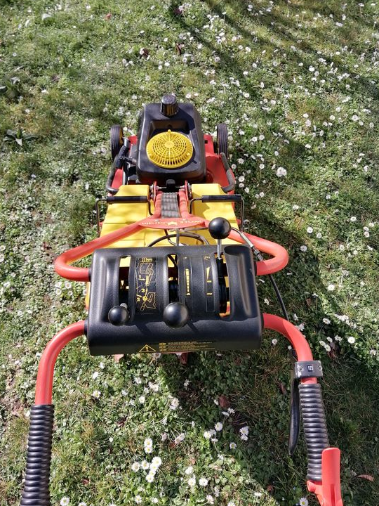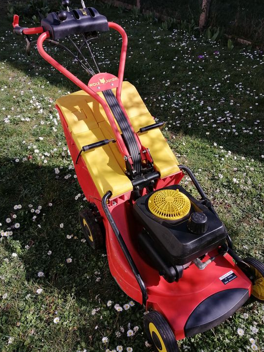 Tondeuse thermique professionnelle Outils Wolf T51F1P tractée de 51cm de coupe ayant peu servie et dans un excellent état avec un rendement de tonte jusqu’à 2240 m²/h.