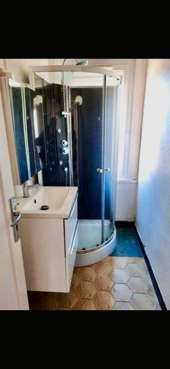 • une salle de bain avec meuble lavabo, cabine de douche et rangements ;