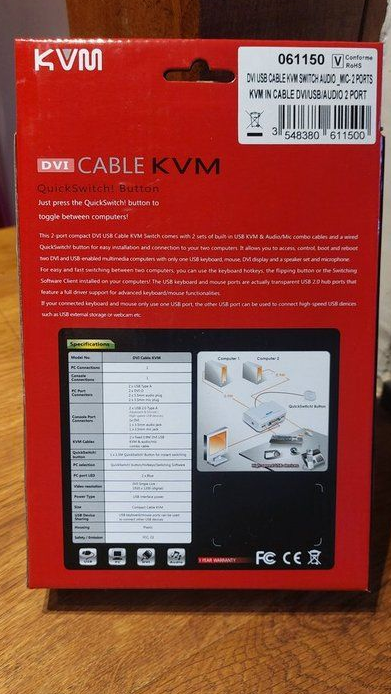 Affichage DVI avec une résolution jusqu’à 1920 x 1200 pixels. Câbles intégrés incluant tous les connecteurs nécessaires USB, DVI, et audio pour chaque ordinateur respectif. Prise en charge audio pour haut-parleurs et microphone des 2 ordinateurs.