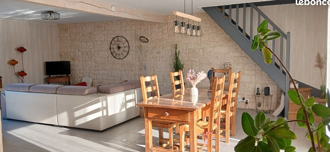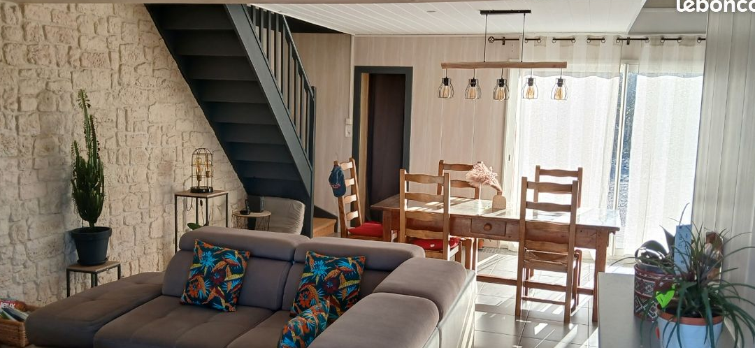 Cette maison de 2 étages comprend un grand salon-salle à manger ; une cuisine ouverte sur le séjour ; 4 chambres ; 1 salle de bain ; une grande véranda ; 2 WC et un grand garage de 100m2.