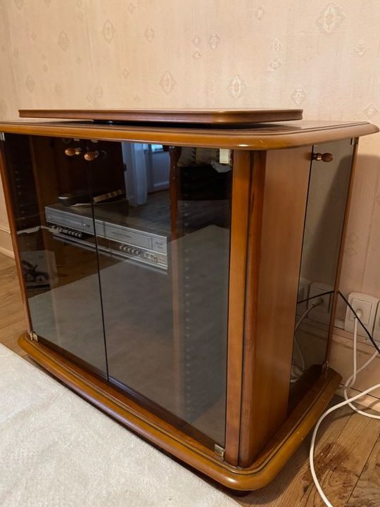 Meuble TV d'angle en bois au style vintage intemporel avec rangements sur les cotés pour cd dvd...