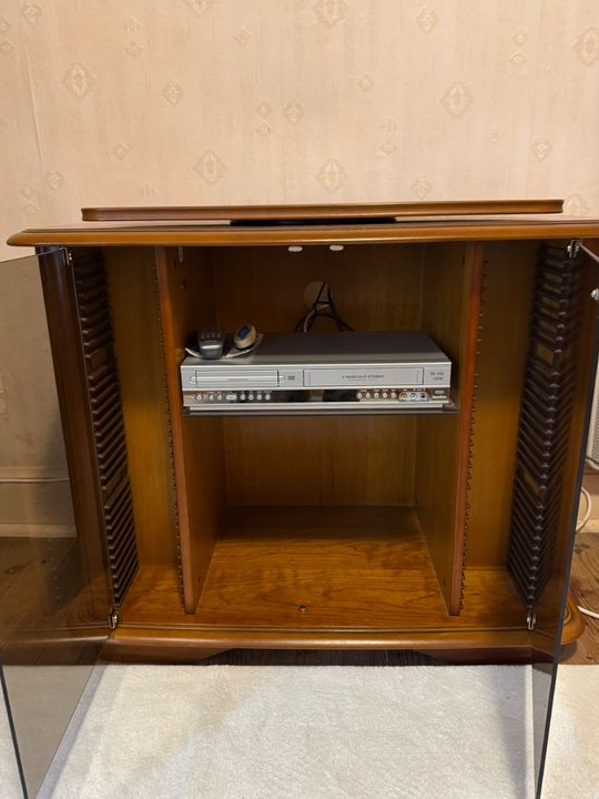 Structure robuste avec finition bois naturel chaleureux et authentique. Les portes vitrées permettent une utilisation pratique de la télécommande tout en protégeant vos équipements.