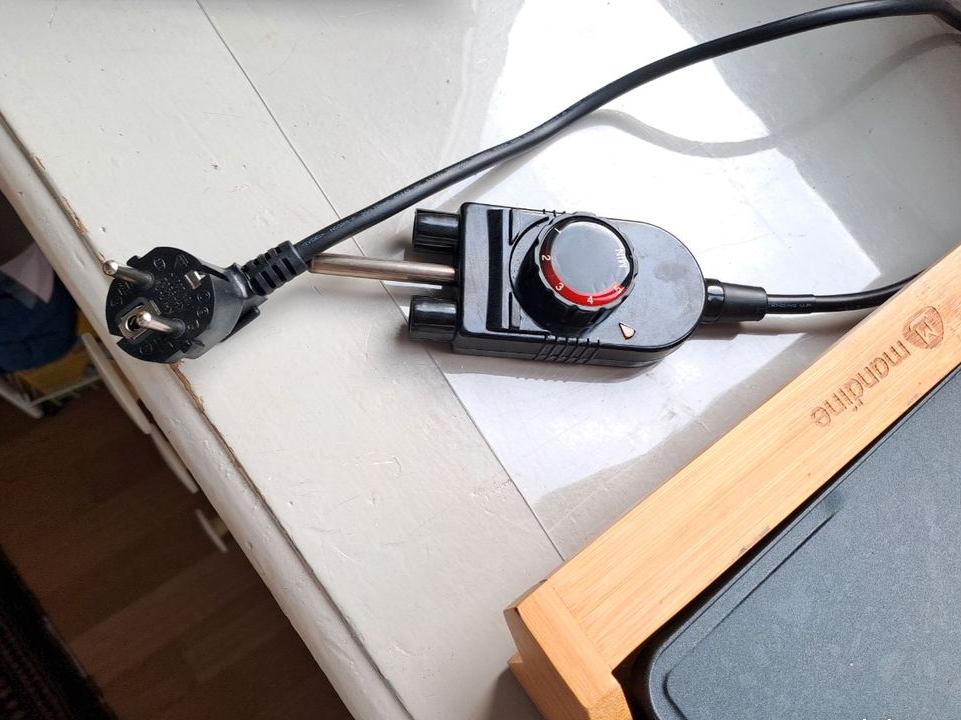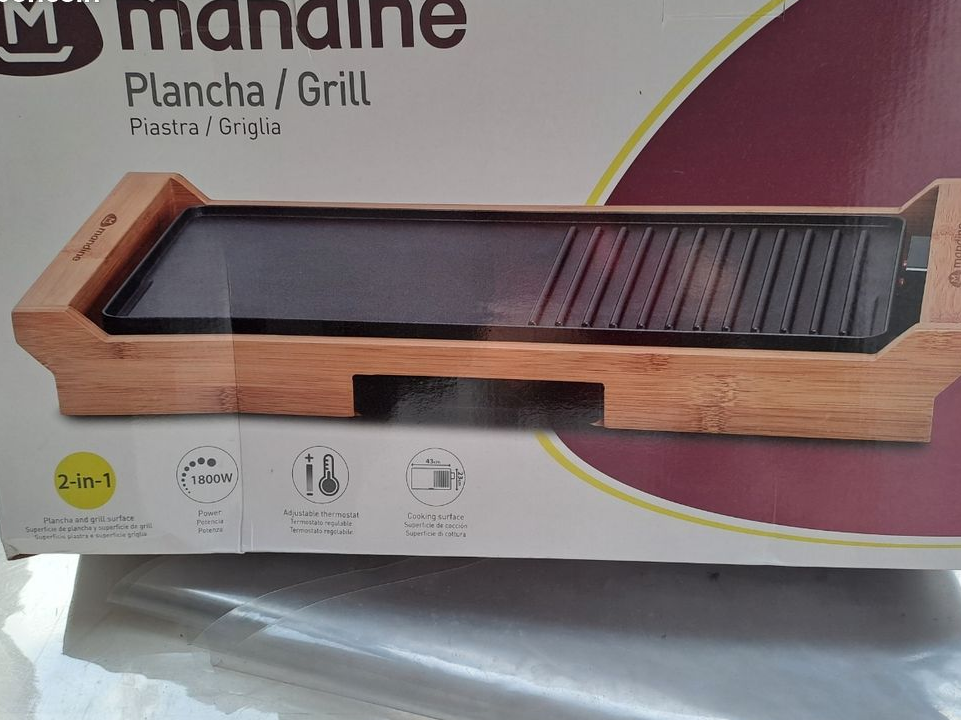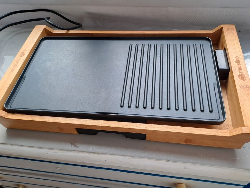 Je vends cette plancha/grill électrique Mandine 2-en-1 avec ses poignées en bambou. Parfait pour préparer vos grillades et plats cuisinés en toute simplicité !