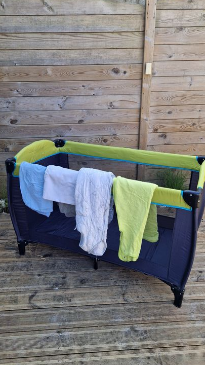 Je vends ce lit parapluie enfant avec une turbulette été et une turbulette hiver et drap housse et alèse incluse.