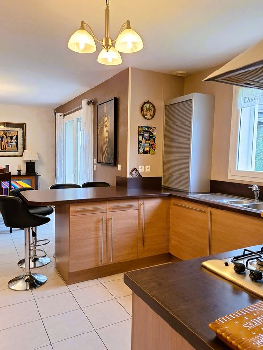 Elle se compose au rez-de-chaussée d’un hall d’entrée avec placards, d’un salon-séjour traversant baigné de lumière, équipé d'un poêle à bois en fonte (Nestor Martin) pour une chaleur douce et économique et communiquant avec une véranda de 12 m² (construite en 2013) ouverte sur le jardin, d’une cuisine ouverte aménagée et équipée avec arrière-cuisine ainsi qu'un WC indépendant. L’ensemble communique avec un garage.