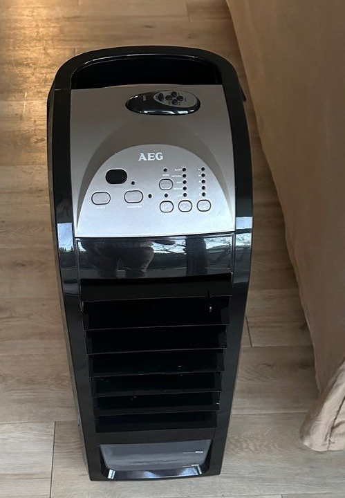 Je vends ce ventilateur rafraîchisseur d'air AEG noir, parfait pour maintenir une température agréable chez vous pendant les périodes chaudes.