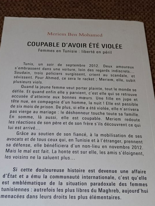 Quand la jeune femme veut porter plainte, tout le monde se défile. Et quand enfin elle y parvient, c'est elle qui se retrouve accusée d'atteinte aux bonnes mœurs. Une fille en jupe et tête nue, en compagnie d'un homme, la nuit ! Elle est passible de six mois de prison. De plus, si elle a été violée, elle n'arrivera pas vierge au mariage : le déshonneur touche toute sa famille. En somme, là aussi, elle est coupable. Meriem redoute les réactions de son père et de son frère s'ils découvrent ce qui lui est arrivé...