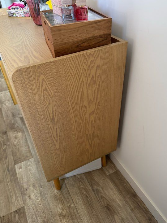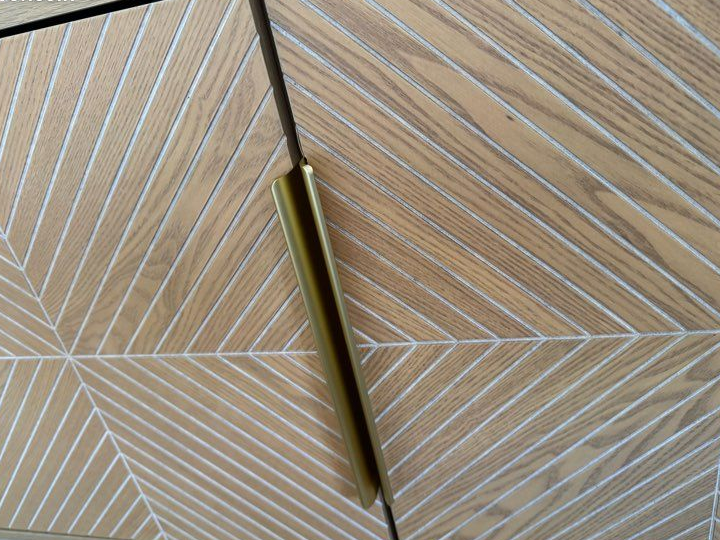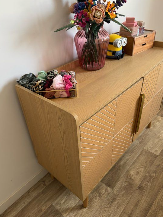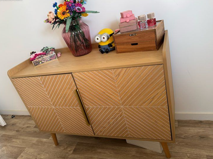 Je vends ce buffet bas Maisons du Monde en bois, avec ses portes aux motifs géométriques dorés. Parfait pour apporter du rangement et du style à votre salon !