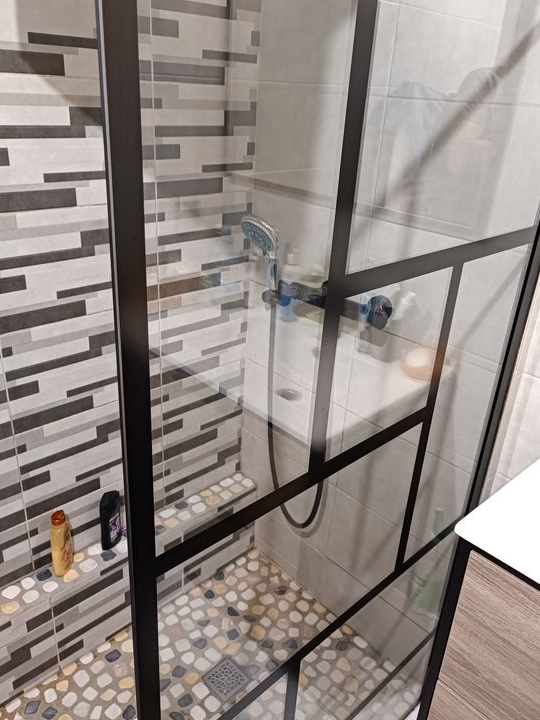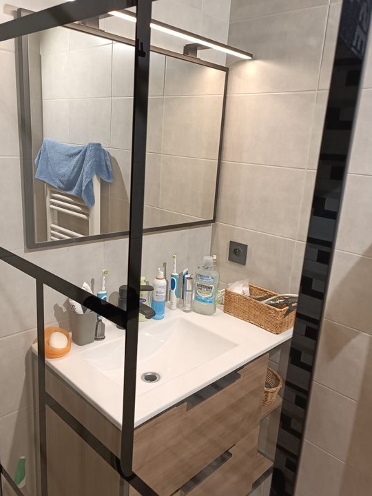 - une salle d’eau équipée d’une douche à l’italienne, d’une vasque sur meuble 2 tiroirs d’un radiateur sèche serviettes . La salle d’eau et les toilettes sont séparés.