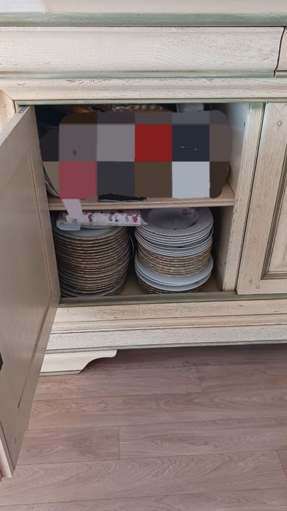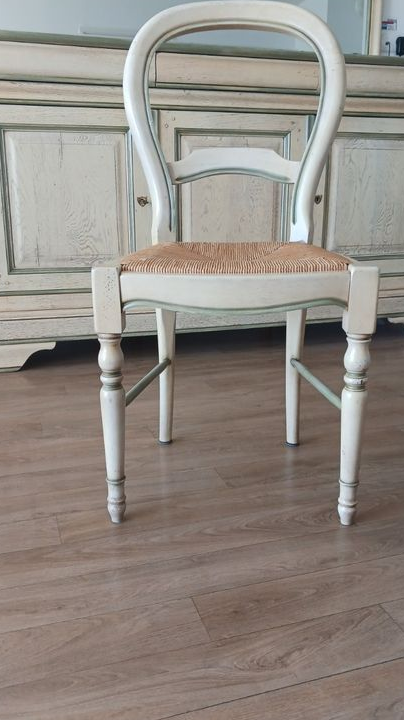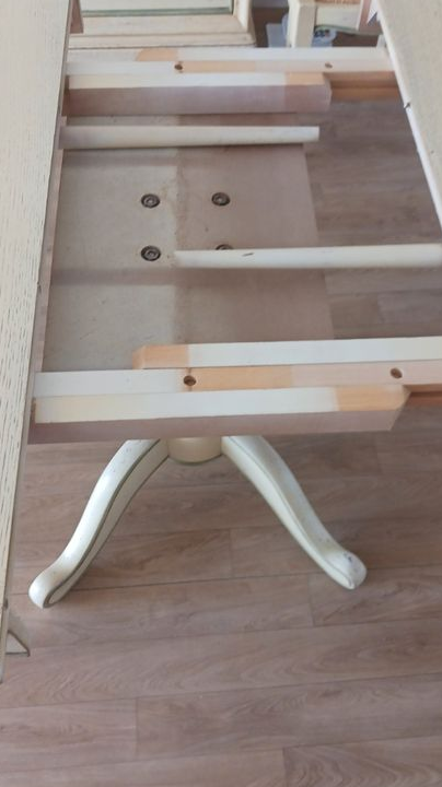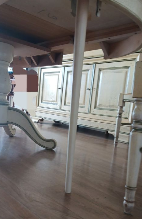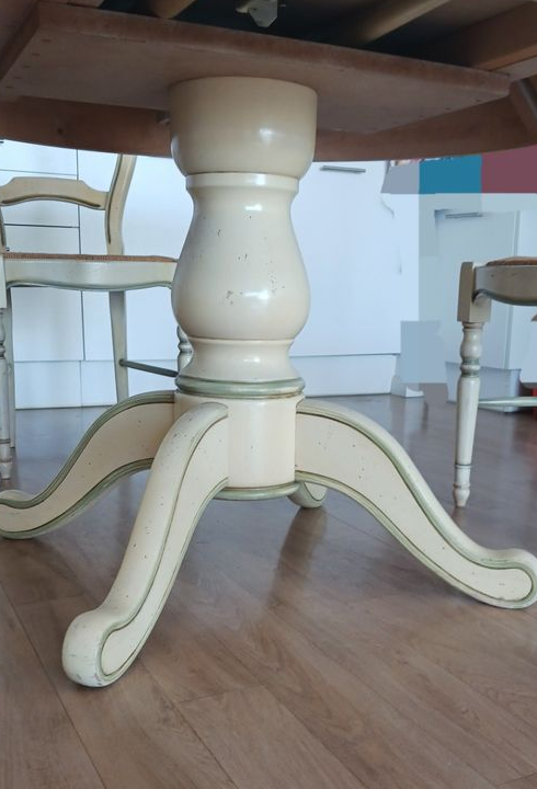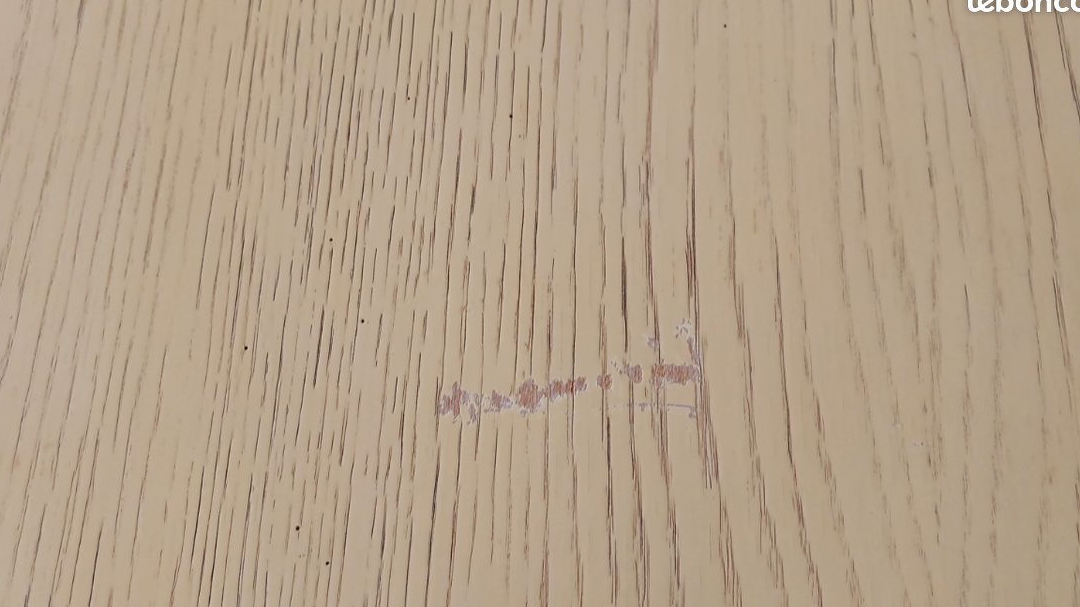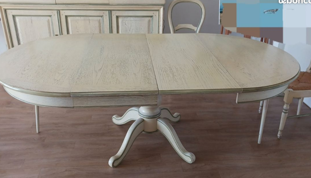La table comporte 2 rallonges qui lui permettent d'accueillir 6, 8 à 10 personnes (une des rallonges à 2 petites rayures sur la peinture photo)