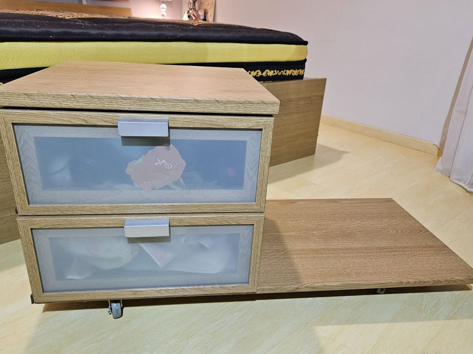 - 2 Tables de chevet HOPEN couleur chêne/verre givré sur roulettes Largeur 100 cm Profondeur 43 cm et Hauteur 50 cm