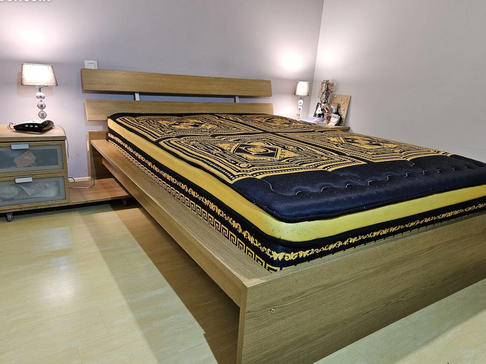lot comprenant un lit de 140X200 avec matelas et 2 chevets couleur chêne clair .