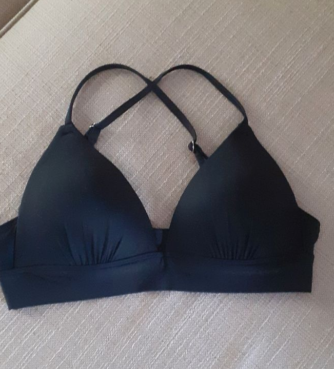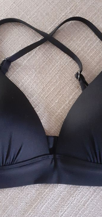 Haut de maillot de bain noir, joli décolleté, bonnet rembourré, bretelles croisées au dos. Peut s'accorder facilement avec bas bikini.