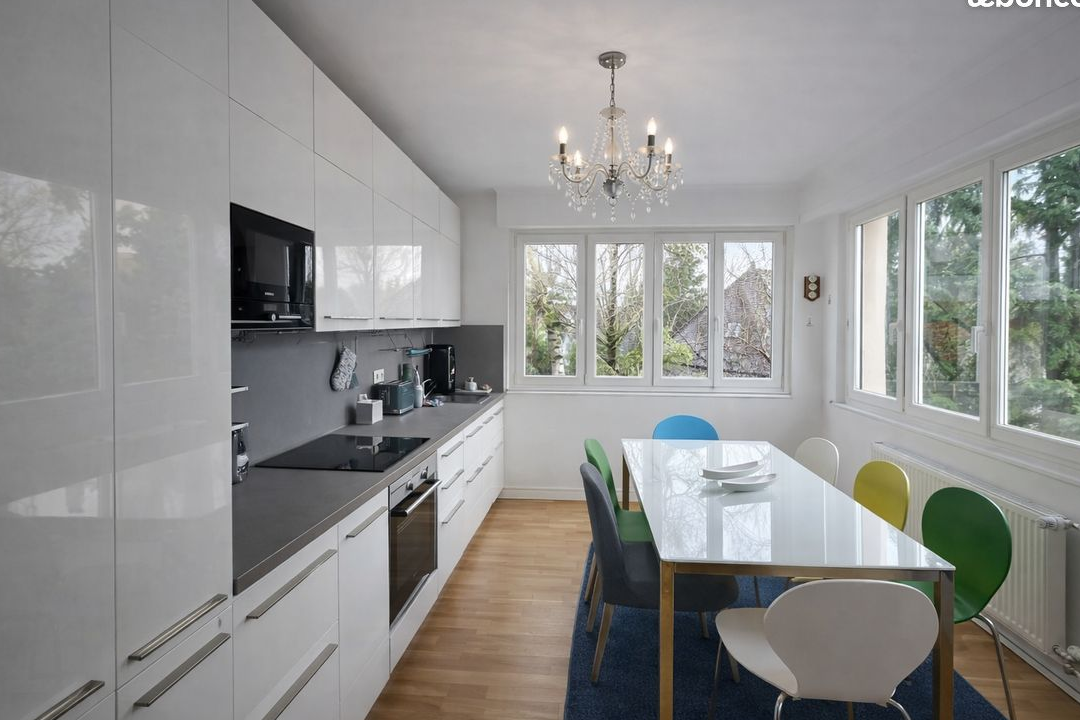 Situé au cœur de la Robertsau, dans une petite copropriété, découvrez ce spacieux appartement 4 pièces de 105 m², offrant un cadre de vie calme tout en bénéficiant de la proximité immédiate de toutes les commodités. Traversant Est-Ouest, il profite d’une luminosité optimale tout au long de la journée. Le bien ne nécessite aucun travaux. Il se trouve à seulement 3 minutes à pied de la station de tram « Robertsau l’Escale » et du Parc de Pourtalès. Le séjour de 19,5 m² s’ouvre sur une cuisine dînatoire de 13 m², entièrement équipée, avec mobilier italien, électroménager et table pour 8 personnes. L’appartement dispose de 3 chambres spacieuses, dont une chambre de 23 m² pouvant accueillir deux enfants, une chambre parentale de 15 m² avec accès au balcon, ainsi qu’une chambre de 14 m² pouvant servir de chambre, de bureau ou de chambre d’appoint. Toutes les chambres disposent de placards intégrés. La grande salle de bain comprend une double vasque, un WC, une douche et un espace buanderie intégré. Un deuxième WC avec grande vasque complète l’ensemble. Parquets, porte d’entrée renforcée et volets électriques viennent renforcer le confort du bien. Le chauffage est collectif. Situé au 2ème étage sans ascenseur, cet appartement est complété par une grande cave saine et un grand garage privatif.