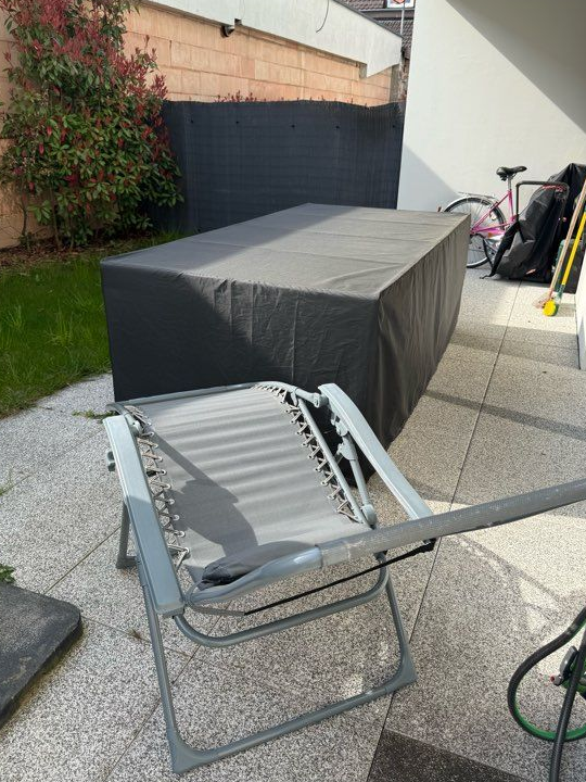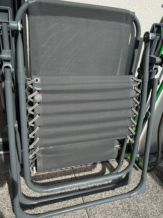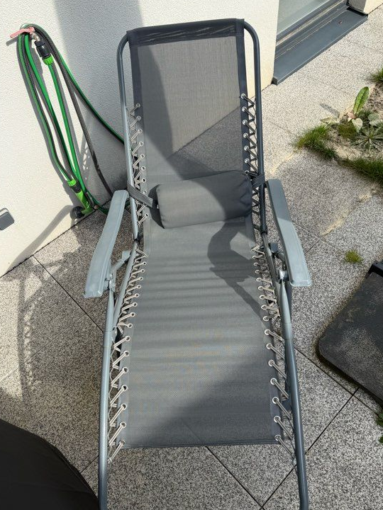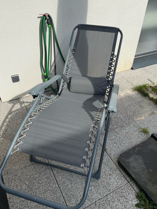 Je vends cette chaise longue pliante grise, parfaite pour vous détendre au jardin ou sur la terrasse. Pratique et confortable, elle se range facilement !