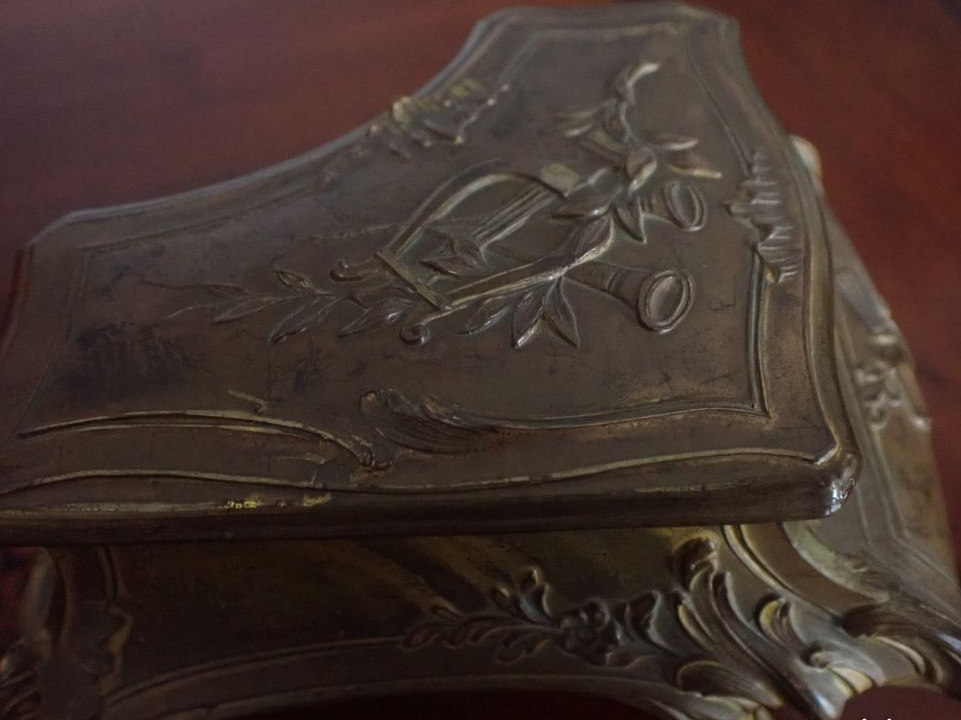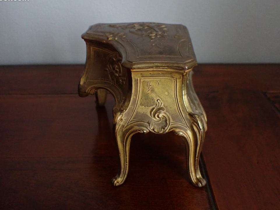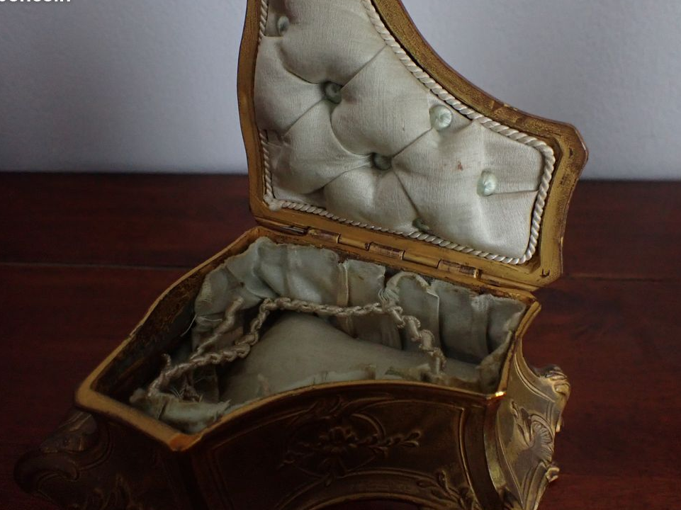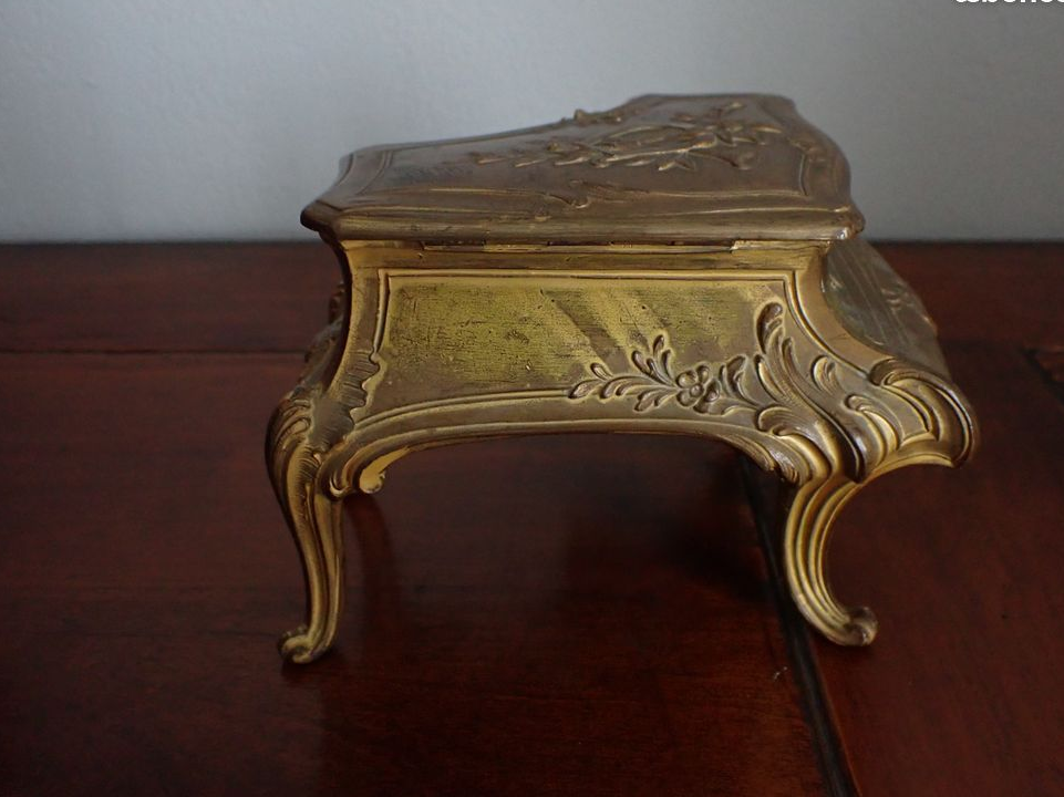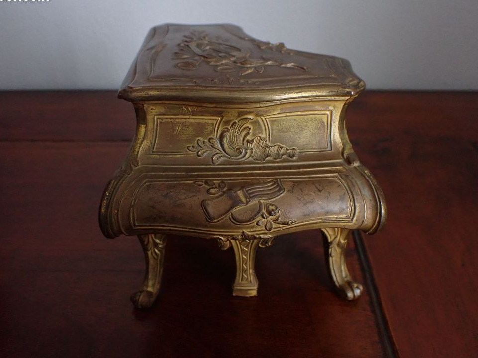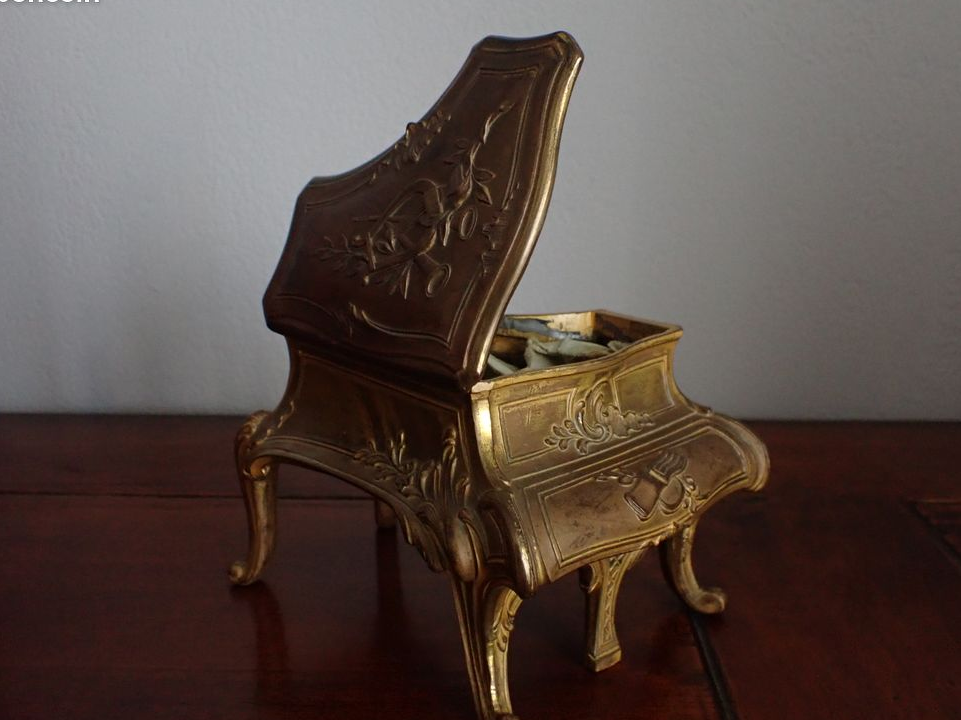 Je vends ce petit piano en métal jaune, joliment ciselé, dont je ne connais pas exactement la composition. Il mesure 9 cm sur 13 cm, pour une hauteur de 9 cm, et pèse environ 735 grammes. L’intérieur pourrait nécessiter une petite rénovation.